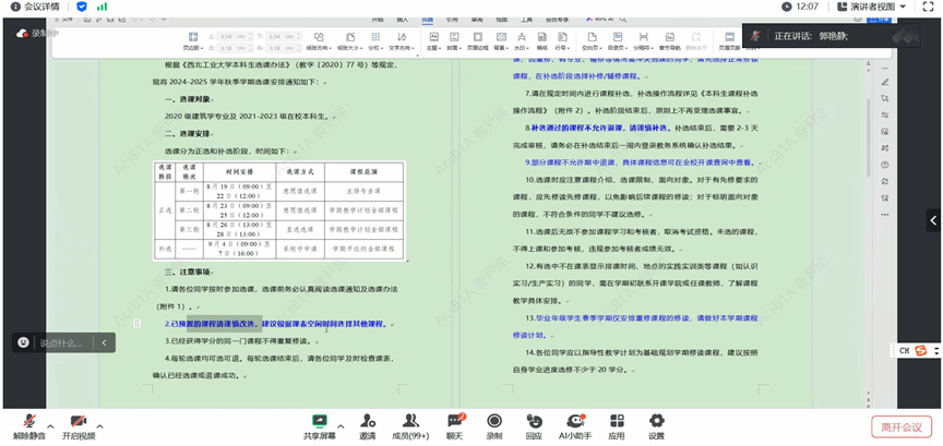 本次系列学业指导会由本科教学秘书郭艳静主持召开,重点围绕选课指导,涵盖培养方案、课程选择、学分认定和绩点计算等关键内容,全方位、多角度地为学生们提供了宝贵的学业规划建议。从明确学业目标到制定具体规划,再到深入理解毕业审查要求等,每一环节都展现了学院对学生发展的深切关怀。