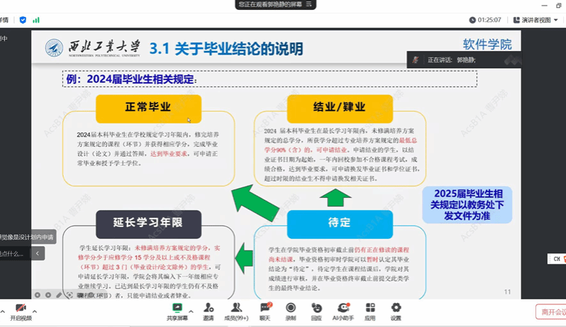 郭艳静为2022级学生解读了选课通知、选课指导性教学计划、课程认定办法及GPA计算方式,强调了预置课程、补选课程、退选课程得重要性,确保每位学生都能科学合理地规划自己的修读课程;针对2021级准大四学生,她详细讲解了培养方案完成要求、毕业资格审查时间表及毕业结论等,帮助学生们提前完成学业情况自查,并解答了毕业审查相关问题,为学生们提供了清晰的毕业路径指引,确保其顺利毕业。