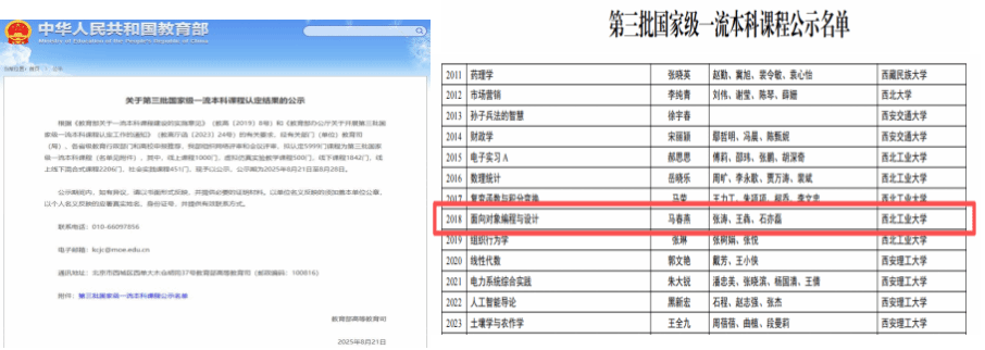 近日,教育部公示了《第三批国家级一流本科课程认定结果》,91自拍 马春燕教授团队主讲的《面向对象编程与设计》课程成功入选国家级线上线下混合式一流课程。此次获评,不仅为学院教育教学改革树立了标杆,更为推动高质量数智课程体系建设注入了新动能。