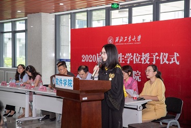 之后,优秀毕业生王炫之发言,她代表全体毕业生对学院领导、老师们的关怀和付出表示感谢,感谢老师们的悉心教导和支持帮助,让自己的大学时光不留遗憾。大学四年,充实的课堂、满意的成绩、丰富的活动、多彩的生活在无数毕业生的心里留下了深刻的印象,如今大学即将落幕,未来即将启程,希望全体毕业生将自己的青春悉数打包带走,继续传承古路坝灯火传承,继续书写西工大现象。