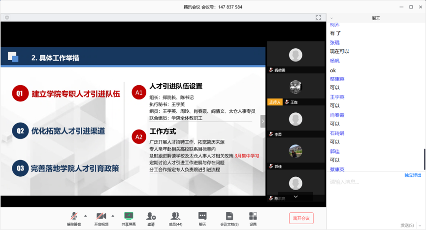 教育教学各项工作顺利开展,学生对线上授课情况满意度较高,陈书记肯定了全体教职工的辛勤付出,并建议大家总结线上授课经验,结合教学法积极探索怎样在线上授课中继续保持高质量的授课效果,为培养特色软件人才持续助力。