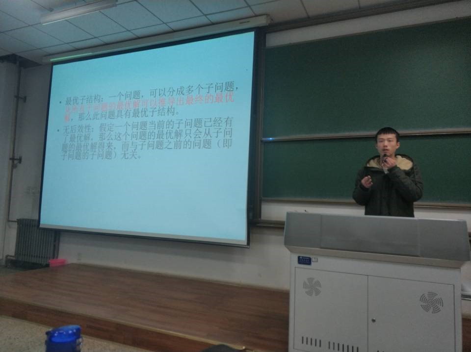 首先给大家作报告的是来自软件工程九班的李昌骏同学。李昌骏同学先引入noj引例-危险的组合,向大家介绍了动态规划的相关内容,并通过优化这道题来向同学们讲解动态转移方程和递推。然后李昌骏同学又通过hailstone向大家科普了一些有关时间复杂度的问题。最后李昌骏同学又教给大家如何更快的处理查询的问题。在讲解的过程中,同学们认真听讲并且积极踊跃的提出自己的问题,李昌骏同学也耐心地为同学们一一解答。
