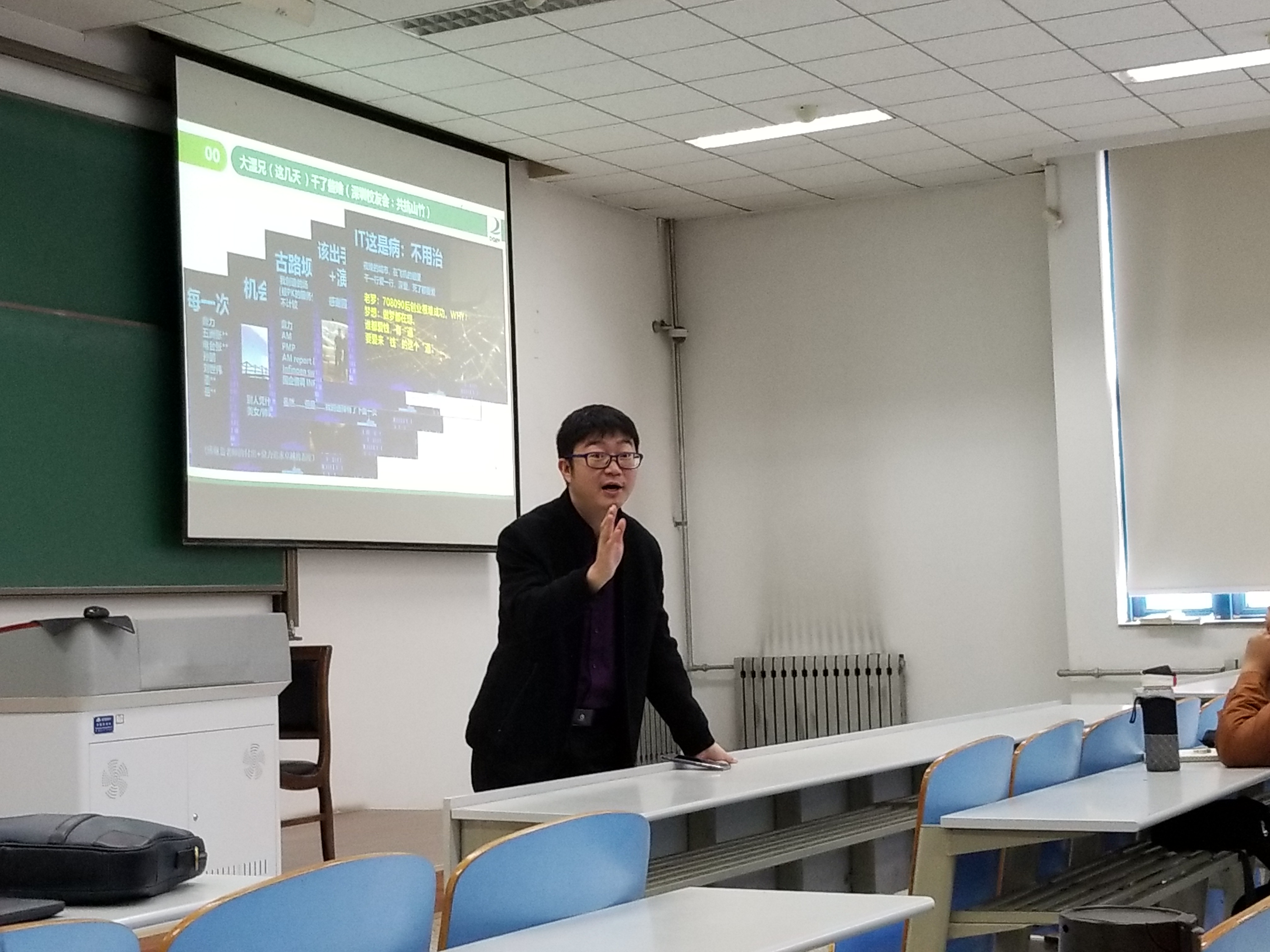 后面,刘世伟介绍了他的学习、工作以及创业的经历,向同学们讲到在大学要真正的丰富自己,坚定自己的理想,多学真正本领,在以后少走弯路错路,他还向大家展示了他们公司开展的关于IT行业现在基于大数据对于人才评估的新方法,让同学们开拓了眼界。