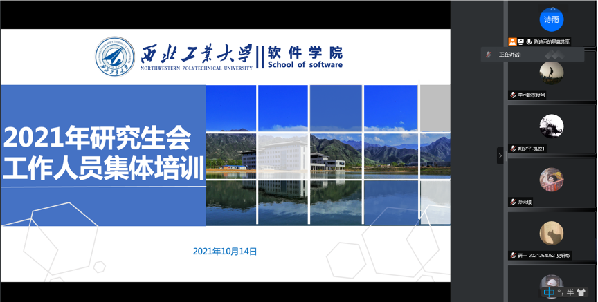 为了更好服务同学,完善研究生会运行机制和改进工作流程,凝聚每一位成员的力量,2021年10月14日研究生会执行主席陈诗雨开展了2021年研究生会工作人员的第一次集体培训,为了响应疫情防控工作,会议采用腾讯会议的方式。