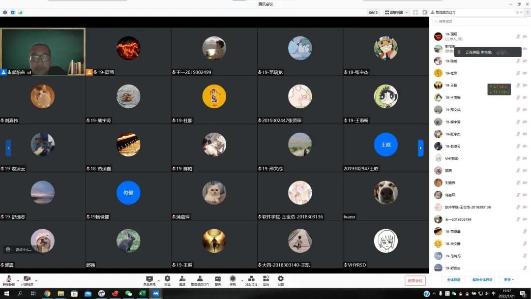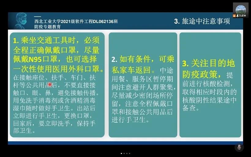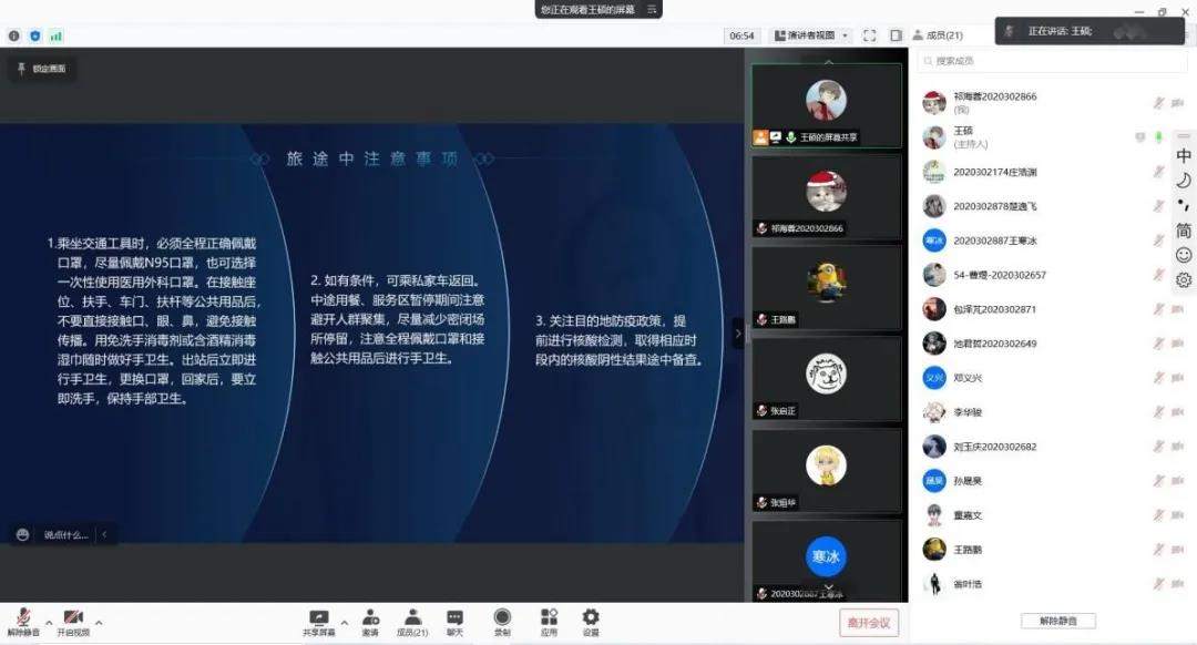 郭培荣副院长在班会中,针对学生寒假的留校离校注意事项作以讲解,提醒学生离校前一定要咨询好家乡所在地的防疫政策,提前收拾好自己的行李,不要遗漏自己的重要证件。此外他还为同学们讲解了新冠肺炎的传播途径,并在此基础上提醒同学们在返乡途中该怎样做好防护工作,提醒同学到家之后一定第一时间给班主任报平安。同学们认真听讲,有问题及时开麦提问,将注意事项牢记于心。