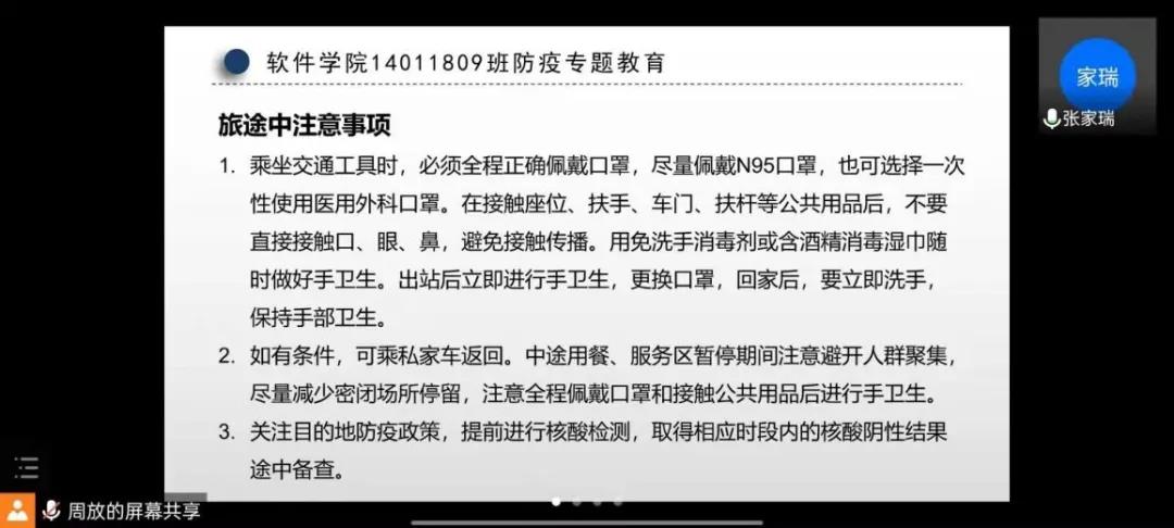 14011901班、14011903班班主任魏倩茹为同学们开展了防疫教育主题班会,给同学们讲解了回家要注意的事项以及要求,同时回答了同学们的问题。随后陈洪亮书记又对其中几点内容进行了详细的描述,强调大家要注意家乡的具体政策,确保自己能够安全平安回家,以及关于两证(核酸检测证明和返乡证明)的重要性。