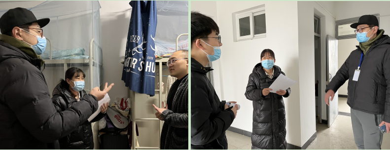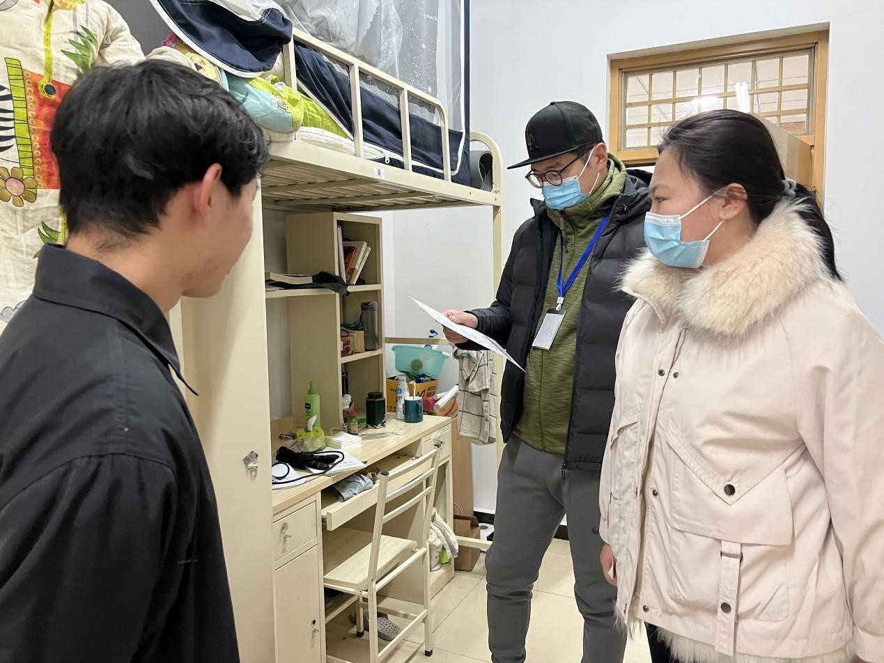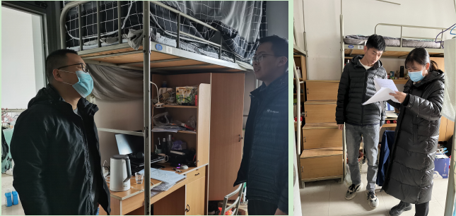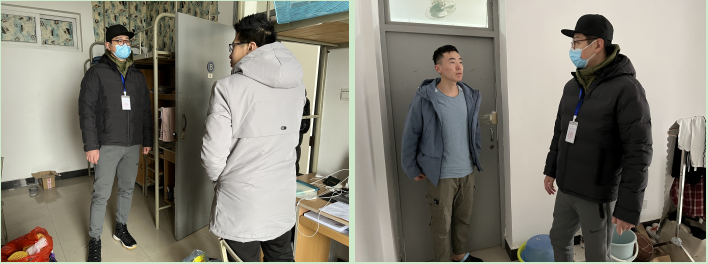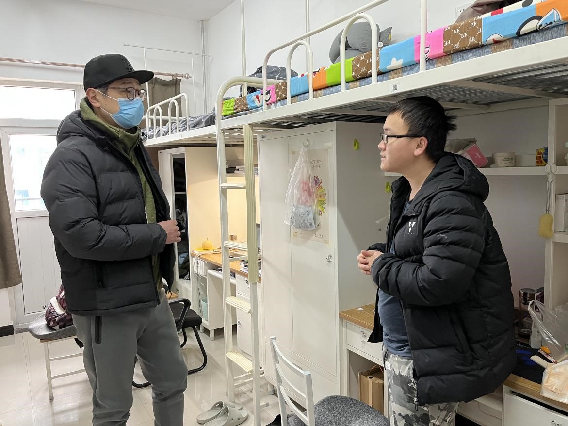“同学们在校期间要遵循学校相关管理规定,继续做好日常防护措施,按要求做好疫情每日填报,有困难及时联系值班老师和学生负责人,学院将竭尽全力做好留校学生的保障工作。”在学生宿舍走访过程中,张龙多次询问留校生在寒假留校期间的打算,关心他们假期在校的生活、工作、学习情况和需求,并送去了学院对留校学生的关怀。张龙希望大家能够努力学习,珍惜寒假宝贵的独处时间,合理安排学业计划,潜心学习;叮嘱大家要充分认识到疫情防控的重要性,注意自身安全防护,坚持运动的生活习惯;提示大家要与父母保持联系,随时反馈在校生活情况,让家人放心。
