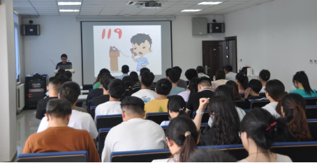 学校保卫处消防科胡涛老师从火灾类型、火灾疏散、逃生技巧和高校学生宿舍的火灾隐患等方面分享了消防安全基本知识。他表示,电气火灾数量位居各类火灾之首,学生要规范用电,不要私接电线和使用违规电器,从自身做起维护学生宿舍的正常学习、生活秩序,切实保障自己和他人的人身和公私财产安全;面对火灾,要在准确判断危险地点和逃生方向后进行火场逃生,要做好个人防护,防止吸入大量浓烟导致窒息、中毒的二次伤害;在确保个人安全后,及时拨打119进行报警,挽救更多生命。他还特别强调了电动车的使用规范及其燃爆的严重后果,呼吁师生选用正规厂家的产品,严禁电动车进入楼宇。现场播放电气火灾、如何正确拨打119、电动车起火的短片,形象直观地展示了火灾的危害,起到了警示作用。