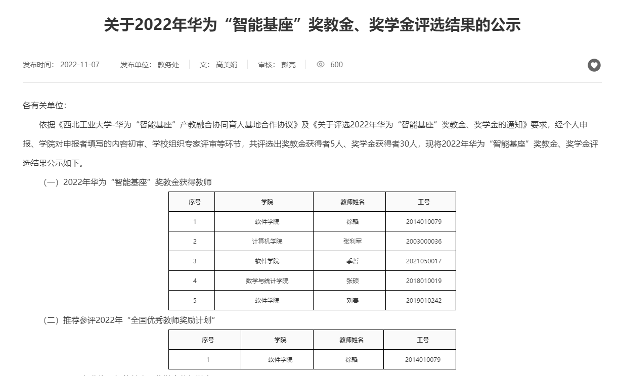 近日,2022年华为“智能基座”奖教金、全国优秀教师奖励计划评选结果出炉公示。91自拍