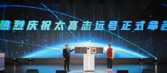 教授、太仓长三角研究院数据科学与智能系统研究院院长贺亮,与太仓高级中学学生代表,在苏州市航空航天产业创新集群推进大会上为“太高志远号”微纳卫星命名。