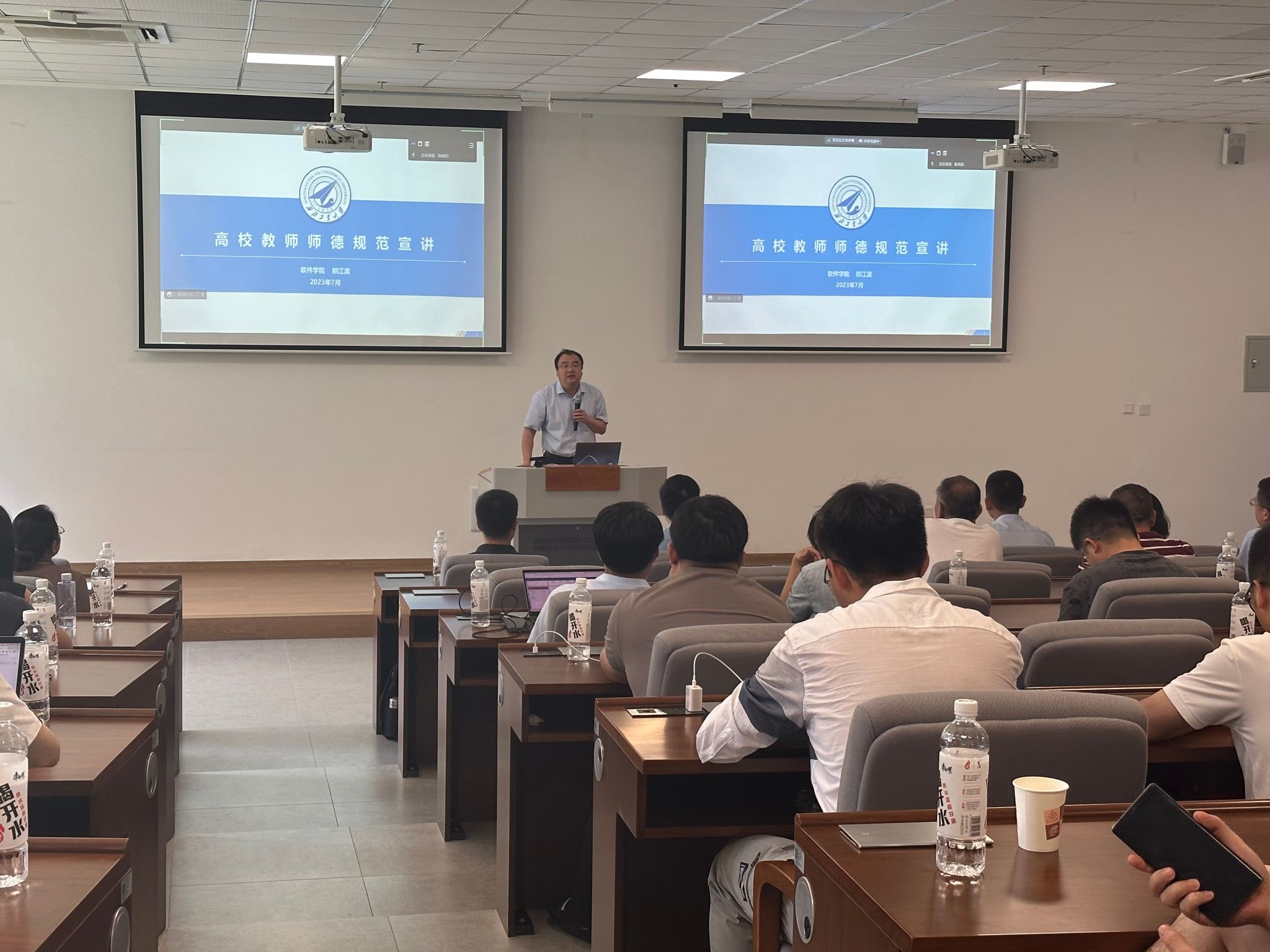 会议第二项,学院院长郑江滨作《高校教师师德规范宣讲》,带领全体教职工学习了习近平总书记关于教师队伍建设的重要指示批示精神和国家关于高校教师师德规范相关文件要求,对《新时代高校教师职业行为十项准则》《研究生导师指导行为准则》《关于高校教师师德失范行为处理的指导意见》《91自拍