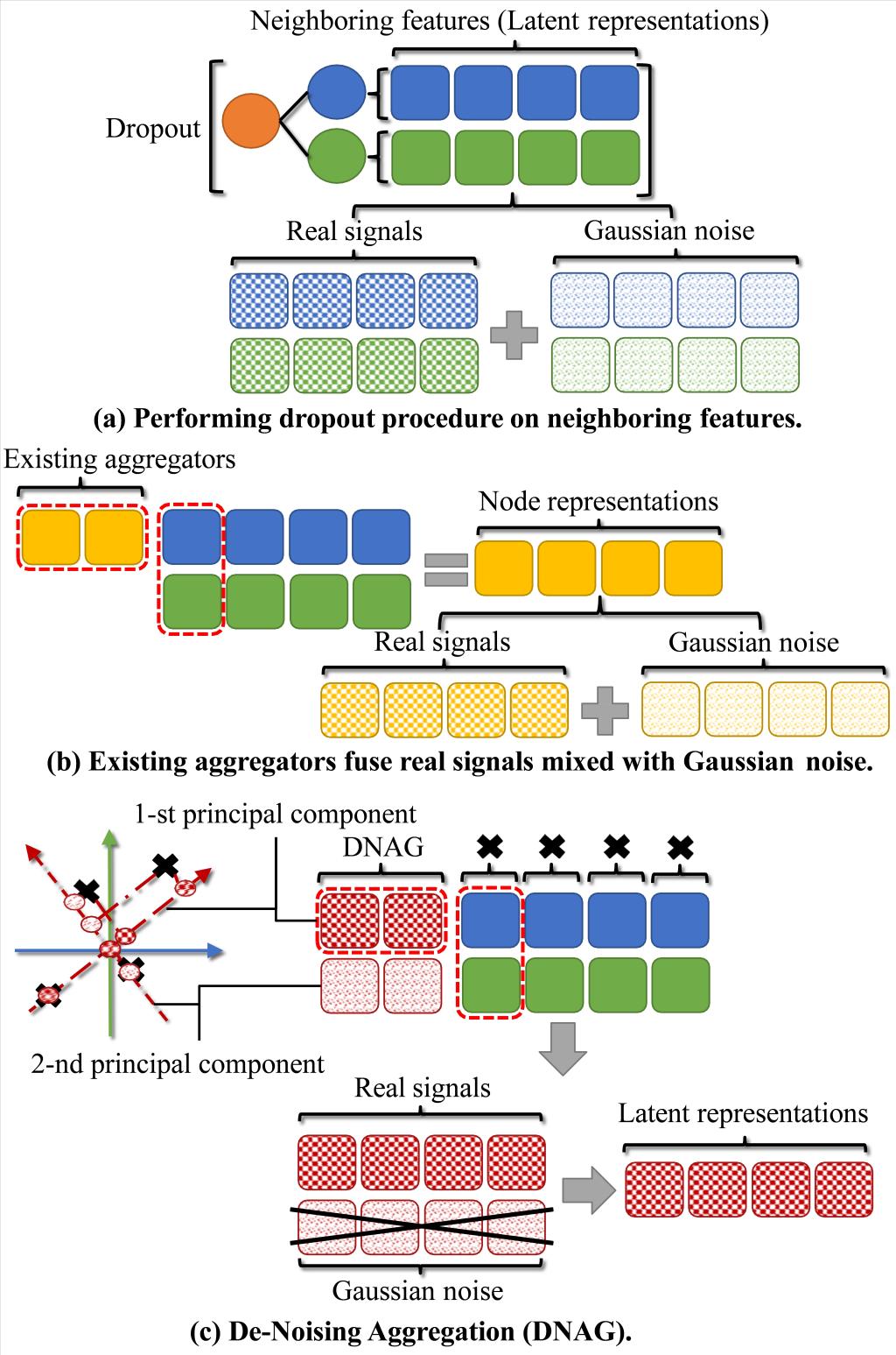在TII 2022: De-Noising Aggregation of Graph Neural Networks by Using Principal Component Analysis文章中,作者指出,为了避免图神经网络应用在测试集上的过拟合现象,通常在其特征编码器中加入Dropout操作来增加模型的泛化特性。然而,该操作不可避免地会在图神经网络的聚合算子中引入高斯噪声,污染了该聚合算子的聚合信号。为了解决这一缺陷,该文提出了一种去噪聚合算子,该聚合算子利用主成分分析算法提取真实的聚合信号,并去掉高斯噪声。与主成分算法常常用于压缩特征维度不同,该文提出的方法用于压缩节点邻域子图的信号维度,使得该图聚合算子具有良好的去噪能力。该文还提出了一种简化的模型训练结构,在训练之前,仅通过计算一次代价昂贵的主成分分析算法,便可得到具有去噪功能的聚合算子。在多个数据集上的实验表明,该文的去噪聚合算子提高了图神经网络的性能,达到了去除噪声的目的。(论文链接://ieeexplore.ieee.org/abstract/document/9729514)