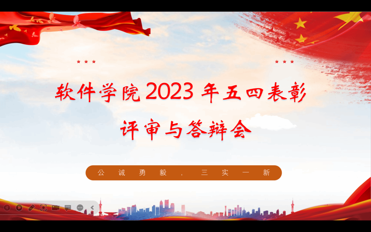 首先,五四红旗标兵答辩候选人周子龙进行答辩。他从学生工作、个人成绩、所获奖项、社团经历等多方面讲述个人事迹,展现了自身的能力。刘俊腾同学也进行了该奖项的答辩,在发言中,他详细讲述了自己加强思想建设,投身志愿服务,争当青年先锋的经历,展现了时代青年的风貌。