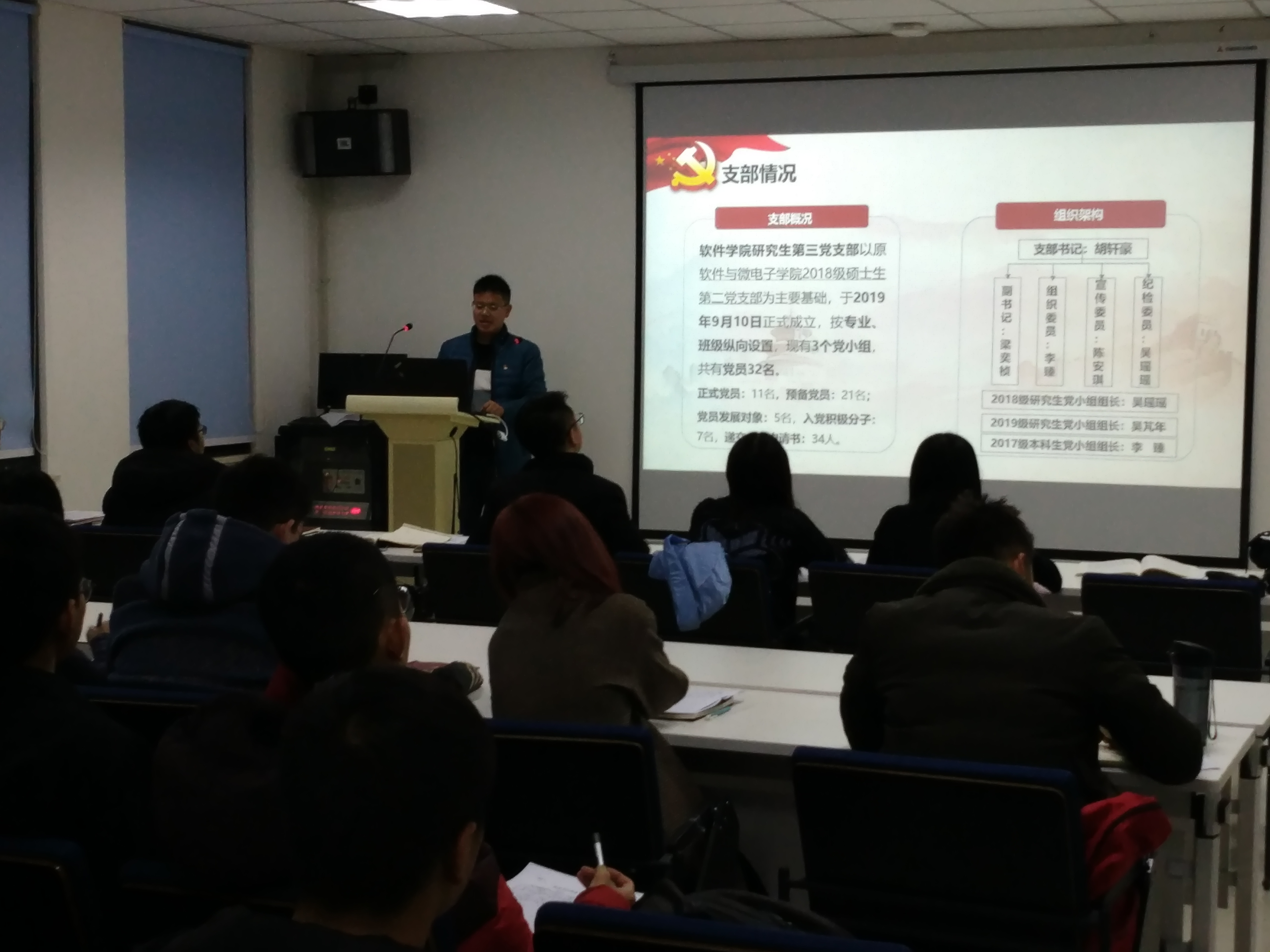 会议开始,胡轩豪同志代表支部委员会就本年度支委工作进行总结与述职汇报,述职汇报主要从支部基本情况、建设思路与组织实施、支委作用发挥和成效特色、工作总结与未来展望等方面开展。