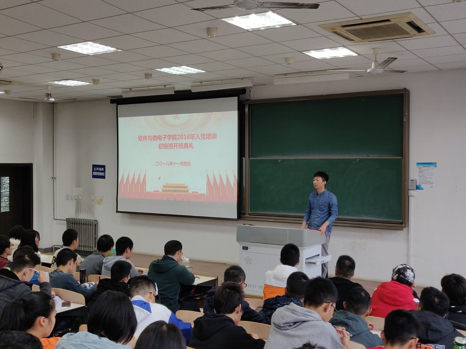 11月4日上午10:30,软件与微电子学院2018年入党培训初级班开班典礼在长安校区教学东楼B206教室顺利举行。学院入党培训初级班全体学员参加了本次培训,本次党课由2018级本科生辅导员樊超主讲。