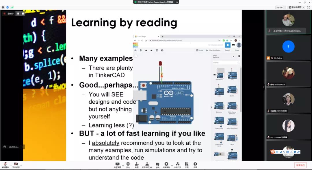 整个教学环节理论与实践相结合,不仅启发同学们的思维,同时也锻炼他们的动手能力。虽然Torben老师和同学们只能在线上交流,但他常鼓励同学们展示自己、参与讨论,不论是线上还是线下提问,老师都能及时回复,给予耐心的解答,轻松的语调也拉近了与同学们的距离。