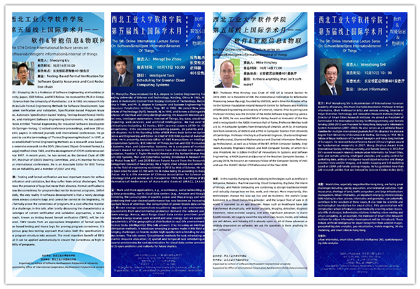 本次学术月会议期间,将邀请来自英美等发达国家及日本、巴基斯坦等国家的知名院校及工业界专家学者17名,线上开展17场前沿学术报告,其中4场为特邀报告,13场为学术报告。会议主要围绕软件、智能信息和物联网的国际研究前沿,讨论工业软件研究背景、面临的挑战和可能的发展技术路线,追踪学科发展新动态。热忱欢迎全校师生莅临本次会议交流讨论,共同助力软件相关学科发展。