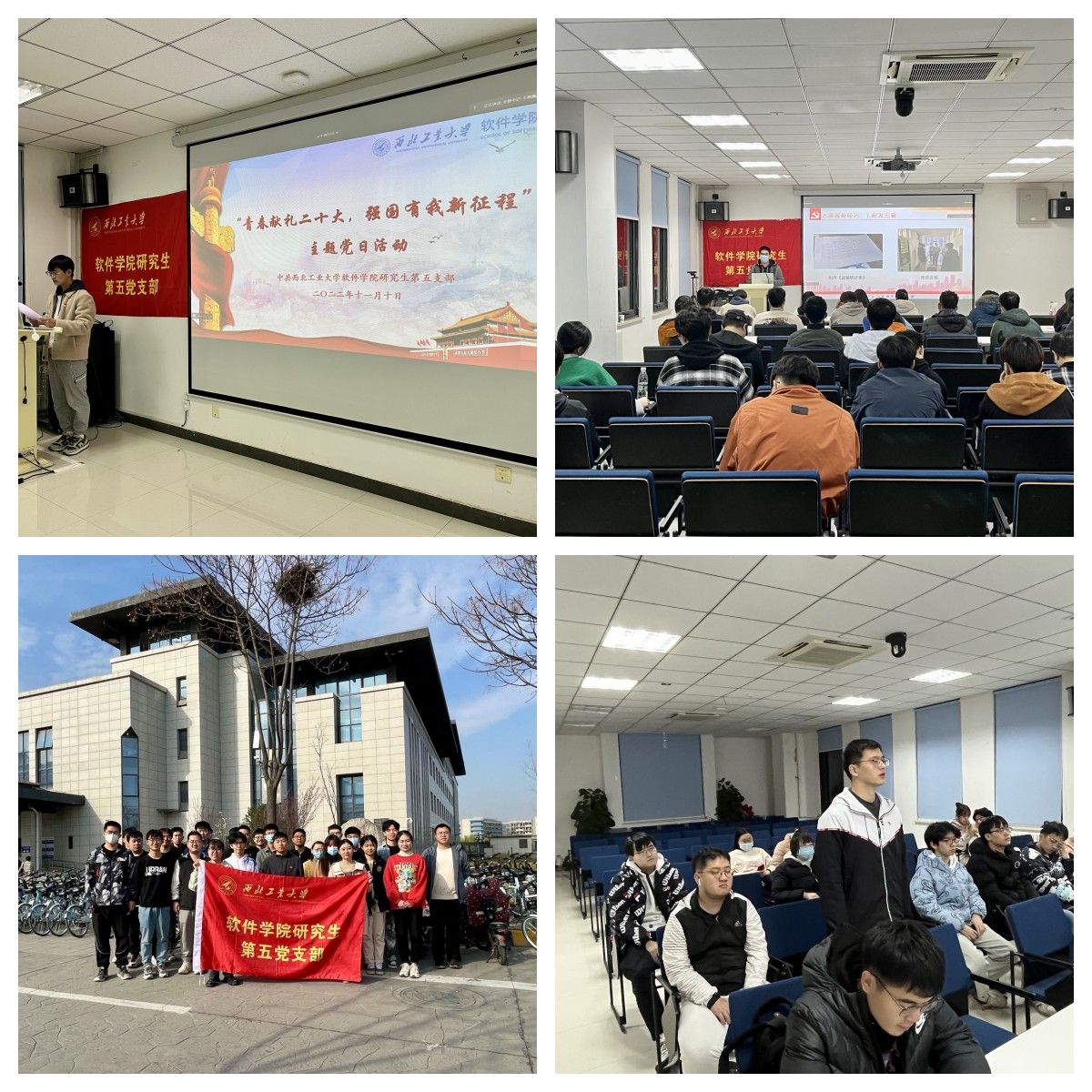 研究生第五党支部的学生党员们一起,齐心协力种下新的一年的点点新绿;在“青春献礼二十大 强国有我新征程”主题党日活动中,支部党员分享青春故事,讲述家乡变化,共同学习了二十大报告,向胜利闭幕的二十大隆重献礼;在“青春献礼二十大 强国有我新征程”主题党日活动中,我支部是唯一一个在两个阶段分别获得校级优秀主题党日的支部;支部成员共同学习国家主席习近平发表二〇二三新年贺词,并发表自己的感想,“卯”劲蓄力,动如脱兔般奔赴“远征”之旅;在雷锋月活动中,我支部通过重温入党誓词,学习雷锋日记以及摆放校内共享单车来缅怀雷锋,学习雷锋精神。